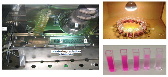 Experimental tests to measure the photocatalytic activity: (a) NOx degradation efficiency (1: lamp for light irradiation, 2: quartz window, 3: test specimen, and 4: temperature stabilizer); (b) degradation of an organic dye; (c) aqueous solution of an organic dye of different color intensity over time, thus indicating its degradation.
