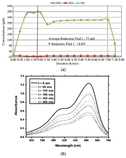 Results of photocatalytic tests: (a) variation (over time) of gas concentration, indicating its photodegradation (Reprinted with permission from [60] Copyright 2014 American Society of Civil Engineers); (b) absorbance variation (over time) of the dye’s aqueous solution, indicating its photodegradation (Reprinted with permission from [6] Copyright 2013 Elsevier).