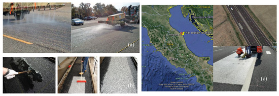 Regarding the application in real scenario context or small test sections, some first approaches were performed (Figure 6). Bocci et al. applied a bituminous emulsion containing TiO2 and cement mortar made of sand, cement, additives, and TiO2 sprayed over asphalt mixtures onto Highway A14 in Italy. The coatings were applied to the right and emergency lanes of the road and their performance was monitored for 527 days. The most important variables that contributed to the decrease in emulsion efficiency were the low temperatures and rainfall. Its efficiency has been reduced by about 80% in just 100 days. The authors concluded that, for tunnel applications, where weathering would be avoided, the best alternative should consist of the application of a bituminous emulsion, while, for the case of emergency lanes, the best option could fall on the use of cement mortar [73].