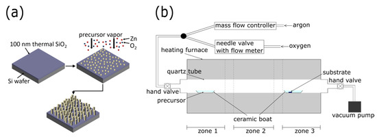 For the growth of ZnO nanowhiskers, zinc acetylacetonate hydrate powder (purchased from Sigma-Aldrich) and oxygen (purity 5.0) gas were used as precursors. All chemicals were used as received unless otherwise stated. Growth was carried out in a horizontal three-zone tube furnace (MTI corporation, OTF-1200X-III-UL, Richmond, CA, USA). A schematic of the growth is presented in Figure 1b. The zinc acetylacetonate hydrate powder was evenly distributed in a ceramic crucible (width 0.7 cm, length 8.5 cm, capacity 7 ml, maximum weight of zinc acetylacetonate hydrate powder which can be loaded 3.5 g) which was placed in the middle of the first heating zone. A 5 mm × 5 mm substrate was positioned in the front-third of another ceramic boat at the beginning of the third heating zone. The tube furnace was evacuated below 0.05 Pa. In a typical process, constant argon (purity 5.0) and oxygen gas flow were used during the growth process resulting in a pressure of 420 Pa. The entire system was pre-heated to 70 °C for 2 h to remove adsorbed substances and to flush the system. In the next step, the temperature of the third zone was increased to the growth temperature. The temperatures of the first and second zone were kept at 70 °C for another 30 min before heating to the final temperatures. The zinc precursor powder (first heating zone) was vaporized at 110 °C. The third zone (growth area) was heated to the growth temperature within 30 min, while the second zone (transition zone) was kept constant at 200 °C. A typical growth process was executed for 4 h. Subsequently, the system cooled down following the furnace’s natural cool-down curve.