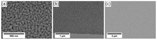 The position of the substrate in the growth zone determines the morphology of the grown nanostructures. Three different positions were investigated (front, center, and back inside the ceramic boat) within the same growth process performed at 550 °C. The corresponding SEM images of the samples are shown in Figure 2. Only when the substrate is placed in the front of the boat (Figure 2a), ZnO nanowhiskers grow. In contrast, a polycrystalline film is formed when the substrate is laid in the center of the ceramic boat (Figure 2b), whereas the growth of only individual island crystallites is observed for the substrate position in the back of the boat (Figure 2c). As it is caused by the large temperature difference for the precursor vapor at the beginning of the third heating zone, the nucleation and growth of the nanowhiskers are preferable at the front position. Most of the precursor is already consumed in the front of the boat, and the concentration of the precursor in the vapor phase downstream is decreased [40,41,42]. Therefore, no growth of nanowhiskers in the center and in the back of the boat occurs. Note, this effect is not only related to the herein used precursor combination, but it has been reported in a study that utilized Zn powder and oxygen gas before. Therein, the length and the spatial distribution of the nanowhiskers on the substrate are decreasing by increasing the distance between the substrate and the beginning of the heating zone in which it is placed [43].