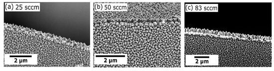We also studied the influence of the argon flow, but the changes in the morphology are not as significant as for the variation of the oxygen flow. The corresponding SEM images are shown in the supplementary information (Figure S1).