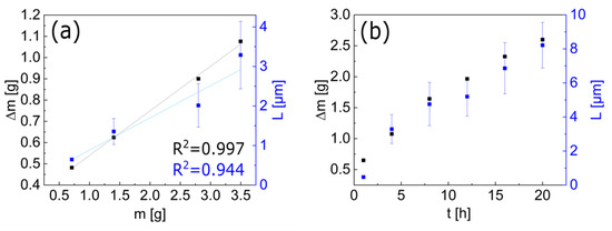 Correlations between the used and consumed amount of zinc precursor, the growth time, and the nanowhiskers’ lengths. (a) The zinc precursor consumption is proportional to the used amount of precursor at 4 h growth leading to a precursor usage of 0.210 ± 0.007 g/g of employed precursor (black squares). Also, the length of the nanowhiskers is proportional to the used precursor amount within a 4 h growth process with a factor of 0.815 ± 0.114 µm/g (blue squares). (b) The precursor consumption (black squares), as well as the whiskers’ lengths (blue squares), show a non-linear dependence on the growth time when using a precursor amount of 3.5 g.