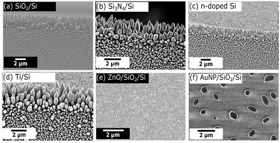 With respect to the aforementioned applications, nanowhisker growth has to be achieved on very different substrates. As shown in the previous sections, equally distributed nanowhiskers with clearly observable surface facets and tips grow on SiO2/Si substrates (Figure 7a) by using 1.4 g zinc precursor powder, 580 °C growth temperature, and 4 h growth time. Similar results can be observed on Si3N4 (Figure 7b) and n-doped Si substrates (Figure 7c). The shapes of the surface facets and tips are similar compared to the whiskers on SiO2, while the length and diameter changed to 1.385 ± 0.072 µm and 236 ± 59 nm for Si3N4 and 863 ± 191 nm and 347 ± 77 nm for n-doped Si. Nanowhiskers are also formed on a 40 nm titanium thin film grown by physical vapor deposition on a standard silicon wafer (Figure 7d). The whisker’s length is 1.08 ± 0.37 µm while the diameter is 389 ± 86 nm. However, the tips of these whiskers were more rounded and the surface facets were not as clearly pronounced as on SiO2, Si3N4, and n-doped Si. When running the same process on a pre-defined ZnO buffer layer (deposited by atomic layer deposition), only a polycrystalline film (Figure 7e) without nanowhisker growth was observed. The growth of ZnO nanowires on a ZnO seed layer has been previously reported in the literature [38,47]. However, different precursor combinations have been evaluated in these studies using zinc oxide powder or zinc powder and oxygen for the nanowire growth on a seed layer. Utilizing zinc acetylacetonate hydrate powder and oxygen as precursors as used herein has not been reported for growth on ZnO buffer layers yet, but it might be possible at modified process parameters extending the studied parameter range herein. Lastly, only the growth of ZnO crystallites is obvious in gold nanoparticles (average Au particle diameter 67 ± 25 nm) prepared by dewetting a thin gold film (Figure 7f).