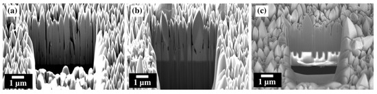 Cross-sectional SEM micrographs after focused ion beam milling of ZnO nanowhiskers grown on (a) n-doped Si, (b) Ti, and (c) a Ti-coated SiN membrane. The SEM images were taken with a tilting angle of 54°.