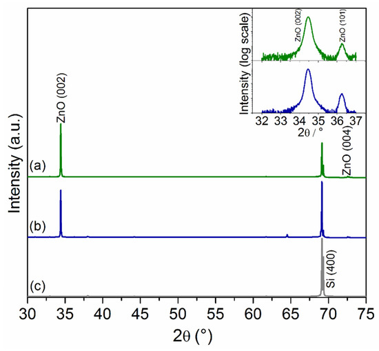 The XRD spectra (Figure 9) of the optimized nanowhiskers showed diffraction peaks corresponding to the planes (002) and (004) of the hexagonal structure of ZnO (PDF 01-070-2551). The analysis shows a clear preferential alignment of the nanowhiskers into the c-axis direction for both runs. The presence of the low-intensity (101) peak, only possible to be visualized in a log scale (inset of Figure 9), in addition to the (002) and (004) peaks, indicates the occurrence of non-epitaxial growth. XRD scans of two different syntheses run under identical conditions prove the high reproducibility of our synthesis routine.