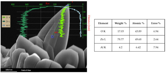 Energy-dispersive X-ray spectroscopy (Figure 10) of a nanowhisker at the substrate edge revealed a homogenous ratio of zinc and oxygen along the nanowhisker axis. The atomic ratio amounts to 1:1 for Zn:O within the given error.