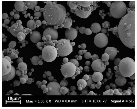 The composite coating material used in the experiment consisted of WC-10Ni powder of 11 μm to 45 μm, AgCuTi solder of 30 μm to 45 μm, and a trace amount of binder. Among them, WC-10Ni powder was produced from Chengdu Ketailong Alloy Co., Ltd., (Chengdu, China) and AgCuTi was produced from Shanghai Dahua solder (Shanghai, China). Figure 1 shows the microscopic morphology of AgCuTi powder.
