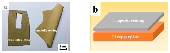 WC-10Ni powder, AgCuTi solder, and binder were weighed on an electronic balance with a mass ratio of 4:5:1. After stirring and mixing, it was repeatedly rolled into a tape shape by a roll mill to a thickness of 1 mm to prepare a composite coating material. As shown in Figure 2, this composite coating can be cut and folded at will. The substrate was T2 copper plate, and the size was 30 mm × 30 mm × 3 mm. WZB-20 vacuum brazing furnace of Zhongshan Kaixuan Vacuum Technology Engineering Co., Ltd. (Zhongshan, China) was selected. The surface of the copper plate was ground with 400#, 600#, 1000#, 1200#, 1500# sandpaper, and then the copper plate was ultrasonically cleaned in an acetone solution for 15 min, and finally taken out and dried. Before the experiment, the WC-10Ni + AgCuTi composite coating/copper plate was placed in the brazing furnace in the assembly sequence. Vacuum brazing was carried out at brazing temperatures of 830 °C, 860 °C, 890 °C, and 920 °C with a holding time of 30 min. The short holding time was not conducive to the combination of the brazing material and the matrix. The holding time was too long, and the brazing material was easily lost, which was not conducive to the reaction. Further, the heating rate was 10 °C/min, and the cooling rate was 5 °C/min in the experiment.