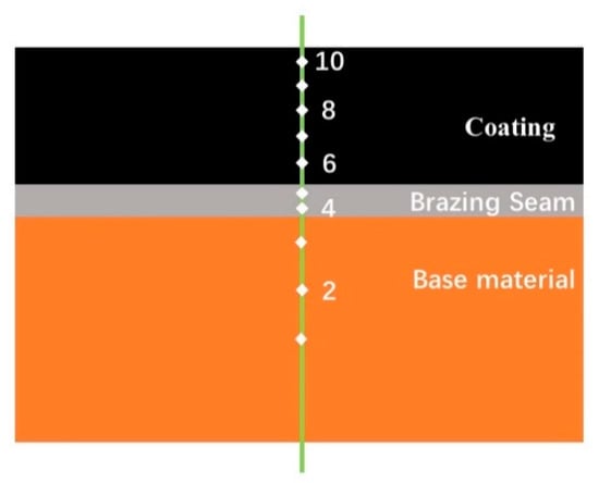 After the brazing was completed, a 10 mm × 10 mm metallographic sample was cut from the sample with a PROTO MAX waterjet. According to the principle of coarse to fine, the sample was water-milled step by step until the surface of the sample was consistent. The water-milled sample was then polished with a 0.5 μm synthetic diamond paste to remove fine scratches on the surface of the sample to obtain a smooth mirror. Finally, the MSD400E inverted metallographic microscope was used to observe the macroscopic morphology of the coating section. Punctual and linear elemental analyses were performed on the characteristic areas of the coating cross-section with a JSM-6480 scanning electron microscope with an energy spectrum analyzer (Kyoto, Japan). The surface of the coated sample was analyzed by Shimadzu XRD-6000 X-ray diffractometer (Tokyo, Japan). The continuous scanning mode was used with a scanning rate of 9°/min and a diffraction angle range of 10°–90°. The hardness of the sample was tested by automatic microhardness tester. Figure 3 is a schematic diagram of the Vickers hardness striking position of the composite coating section, taking points 1–3 on the copper substrate, taking 4–5 on the brazing seam and taking the point 6–10 on the coating. The test load was 300 g, and the load time was 20 s. The coating at each brazing temperature was tested three times and then averaged. The bonding strength of the coating to the substrate was tested using a CMT5205 electronic universal testing machine (Zhuhai, China) and a self-designed shearing fixture, and the coating was tested five times at each temperature.