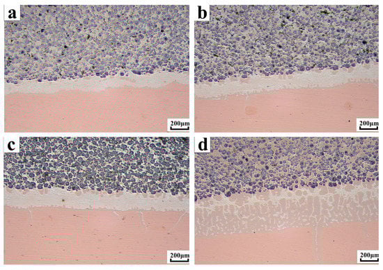 Figure 4 shows the cross-section of the sample at four different brazing temperatures. The orange area below was a copper substrate, the white area in the middle was a brazed joint, and the black area above was a WC-10Ni + AgCuTi composite coating. The composite coating consists of alternating soft and hard materials composed of reinforcing particles WC-10Ni on the AgCuTi brazing filler metal substrate. The hard phase WC particles were evenly distributed, and there was no phenomenon of aggregation or direct contact with the copper substrate. The entire section of the microscopic morphology can be divided into three different interfaces. The first interface was the interface between the braze and the copper substrate. The AgCuTi solder can wet the copper base material well, and the liquid solder and the substrate dissolved each other to form a brazing seam. At 830 °C, the silver in the solder hardly diffused into the substrate. As the temperature increased, the brazing seam gradually widened. More and more silver diffused into the copper substrate, and the copper in the substrate slowly diffused. In the brazing seam, it grew upward like a stalagmite, and it was getting bigger and bigger, more and more. The second interface was the interface between the coating and the brazing seam. As the temperature increased, more and more copper was on the interface. The third interface was the interface between the hard phase particles WC-10Ni and the AgCuTi solder. The AgCuTi solder wetted the substrate and also wet the reinforcing particles WC-10Ni.
