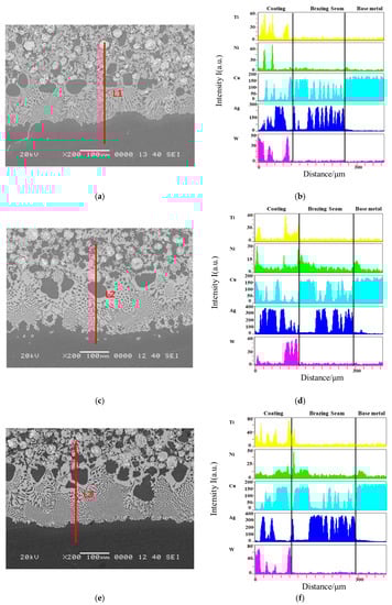 The microstructure of the coating and substrate reaction layers at four different brazing temperatures are shown in Figure 7. The interface between the four coatings and the base metal was well wetted, the microstructure of the brazing joint was dense and uniform, and the WC particles were well wetted with the brazing filler metal. The element line scan was performed at the line segments L1, L2, L3, and L4 in the figure by EDS, and the elements at the interface were distributed, as shown in Figure 7b,d,f,h. It was found that the elements W and Ti hardly diffused into the brazing seam and the substrate, and the elements Ag and Cu diffused toward the substrate. Based on the above analysis, the interface between the brazing seam and the substrate was metallurgically bonded, and the brazing seam mainly carried the combination of the coating and the substrate. As the brazing temperature increased, Cu near the side of the hard layer and Cu near the side of the substrate diffused more, so excessive brazing temperature was not conducive to the metallurgical reaction between the coating and the substrate.