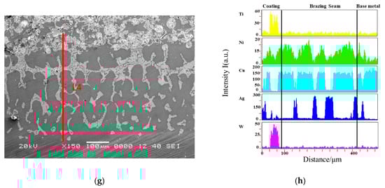 Element distribution a brazed interfaces (a) Line scanning position of the 830 °C coating; (b) Element distribution of the 830 °C coating; (c) Line scanning position of the 860 °C coating; (d) Element distribution of the 860 °C coating; (c) Brazing seam interior; (e) Line scanning position of the 890 °C coating; (f) Element distribution of the 890 °C coating; (g) Line scanning position of the 920 °C coating; (h) Element distribution of the 920 °C coating.