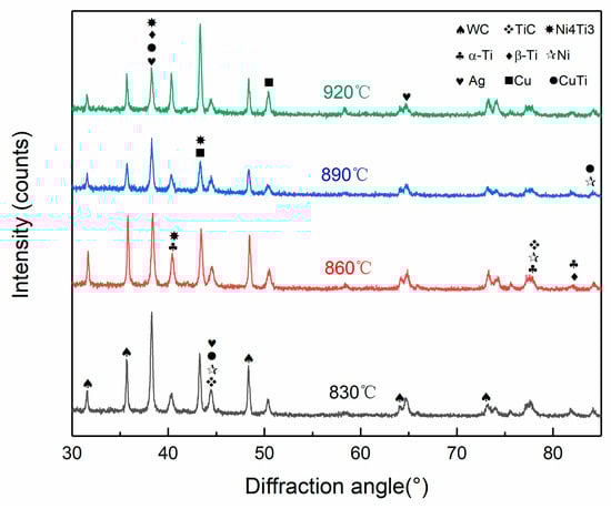 The cross-sectional phase composition of the 40% WC composite coating was analyzed by X-ray diffractometry, as shown in Figure 8. It can be seen from Figure 6 that the main phases on the surface of the composite coating layer were TiC, WC, Ni4Ti3, and CuTi. Ti had two typical allotrope structures, and its low-temperature crystal was α-Ti, which underwent allotropic transformations at 882.5 °C to form high-temperature crystalline β-Ti. At four different brazing temperatures, the Ti element in the joint existed in the form of β-Ti, and the high melting point WC particles could dissolve to some extent with β-Ti. In the subsequent cooling, when Ti changed from β-Ti→α-Ti, since the mutual solid solubility between α-Ti and WC was very low, the Ti element originally dissolved in the WC particles was in its precipitating state around, Ti and Cu formed a Ti–Cu intermetallic compound by the following formula under the strong affinity between the two. During the brazing cooling process, when Ti was released from around the WC particles, it could interact with Cu in the solder layer to form a Ti–Cu compound. Therefore, when the brazing temperature reached 920 °C, there was a harmful Ti–Cu compound in the composite coating. Although the brazing temperature was too high, although the reaction was sufficient, the mechanical properties of the coating were affected.