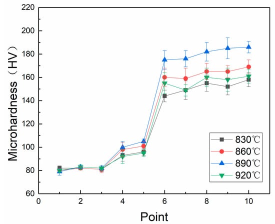 The hardness results are shown in Figure 9. At the same brazing temperature, the hardness from the substrate to the coating gradually increased, and the hardness of the coating was nearly twice that of the copper substrate. As the brazing temperature increased, the hardness of the substrate was basically unchanged, and the hardness of the brazing seam and the coating increased. Until the brazing temperature reached 860 °C, the hardness reached the highest. The temperature rose continuously and the hardness dropped sharply.