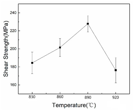 The shear strength test results are shown in Figure 10. Under the conditions of brazing temperatures of 830 °C, 860 °C, 890 °C, and 920 °C, the bonding strength between the coating and the substrate was 184.4 MPa, 201.5 MPa, 227.9 MPa, and 176.3 MPa, respectively. It could be seen that the bonding strength between the coating and the substrate increased with the increase of the brazing temperature, and the bonding strength reached the highest at the brazing temperature of 890 °C. Since the harmful Ti–Cu compound was present in the composite coating when the brazing temperature reached 920 °C, the bonding strength was suddenly reduced. Therefore, the excessive brazing temperature was advantageous for the reaction to proceed sufficiently but had a great influence on the bonding strength of the coating.