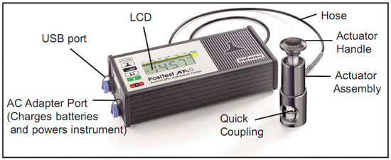 Adhesion strength testing provides the force needed to pull a test diameter of coating away from the substrate. Adhesion tests were carried out in accordance with ASTM D4541-02 [25]. In the present study, an automatic PosiTest® pull-off adhesion tester (DelFesko, NY, USA) was used (Figure 1). This was a self-aligning spherical dolly-head tester (Type V according to the ASTM standard). The diameter of the dolly used was 20 mm. The greatest tensile pull-off force for which the coating could adhere to the substrate was evaluated in terms of mega Pascal. Breaking points occurred along the weakest plane of the whole structure. The adhesion strength (X) was calculated in terms of MPa (Equation (1)).