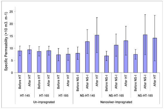 The amount of nanosilver suspension absorption after the impregnation process was measured to be 0.38 g/cm3. Results of the permeability tests showed that the lowest specific gas permeability was observed in specimens before NS-impregnation or heat treatment (NS-HT-165 treatment, 6.898 × 10−13 m3 m−1), and the highest was found in NS-HT-185 after NS-impregnation (15.576 × 10−13 m3 m−1).