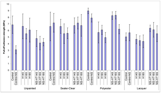 Pull-off adhesion strength (MPa) of different treatments of beech specimens (error bars indicate the standard deviation for each column).