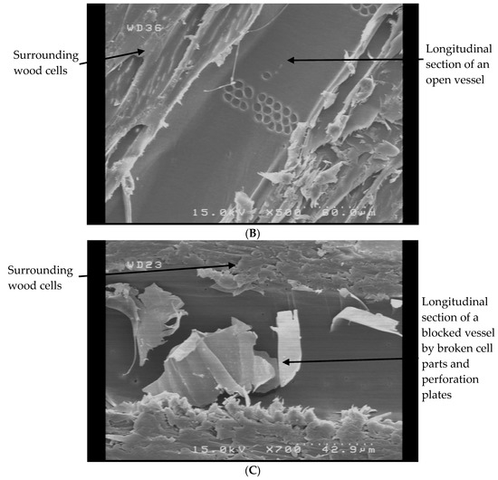 NS-impregnation also resulted in significant increases of permeability in all NS-impregnated treatments. This increase was attributed to the high pressure applied in the pressure vessel, resulting in the rupture of vessel perforations, tyloses, and any other physical obstacle in the way of fluid transfer. SEM images showed vessels that were blocked (Figure 4A). The blockage was ruptured and torn open after NS-impregnation (Figure 4B,C). Therefore, fluid could flow more easily, and eventually, permeability increased significantly.