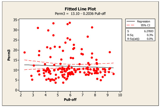 Fitted-line plot between pull-off adhesion strength versus specific air permeability (Perm3 = specific air permeability measured at the third vacuum pressure or water column level).