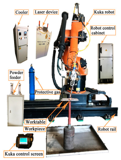 The laser used in the experiment was a 4 kW fiber laser produced by the IPG Company (New York, NY, USA). The laser cladding robot used was a German six-degrees-of-freedom KUKA robot (Augsburg, Germany) the model number of which was KR30HA. The entire machine control system adopted the Siemens PLC controller (Siemens, Munich, Germany) and the model number was S7300. The powder feeder was a SIASUN XSL-PF-01B-2 with a double bin and negative pressure type. Argon was used as the protective gas. A double temperature chiller was used for cooling; this was produced by the Dongluyang Company (Shenzhen, China), and the model number was PH-LW296-TH2P. The laser cladding equipment is depicted in Figure 1.