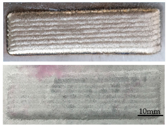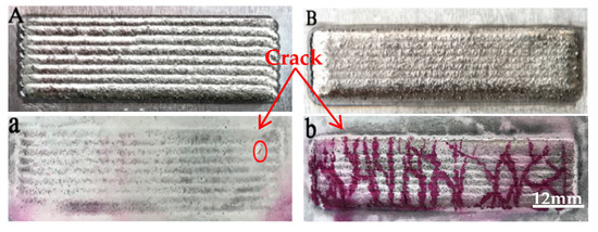 On the surface of the laser cladding layer, the number of cracks generated under different orthogonal experimental schemes was measured by a colored penetrant detection agent, and the crack length was measured to calculate the crack density. The test schemes with the least and largest numbers of cracks in the cladding layer are respectively shown in Figure 2a,b.