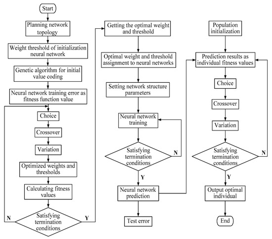 The neural network is characterized by nonlinear fitting prediction. The genetic algorithm can find the optimal solution within the specified range via iterative optimization. The combination of the neural network and genetic algorithm can realize intelligent predictive optimization. Due to the limited number of training samples, the genetic algorithm was used in the present study to optimize the weights and thresholds of the neural network to improve its predictive accuracy, and was then used to optimize the predicted results of the neural network. The overall algorithm flow is presented in Figure 4.