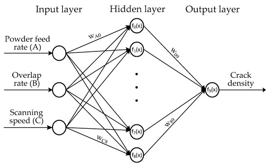 The topological structure of the neural network between the powder feed rate, overlap rate, scanning speed, and crack density was established as shown in Figure 5. The neural network was created by the newff function. The neural network is suitable for prediction and has the characteristics of strong nonlinear approximation ability, a simple training algorithm, and high adaptive ability. The topological structure of the neural network was divided into three layers including the input layer, hidden layer, and output layer. The input layer had three neurons, which represent the powder feed rate, overlap rate, and scanning speed, respectively. According to empirical Equation (2) [26] and the trial-and-error method, it can be determined that there were nine neurons in the hidden layer. The output layer had one neuron, which represented the crack density.