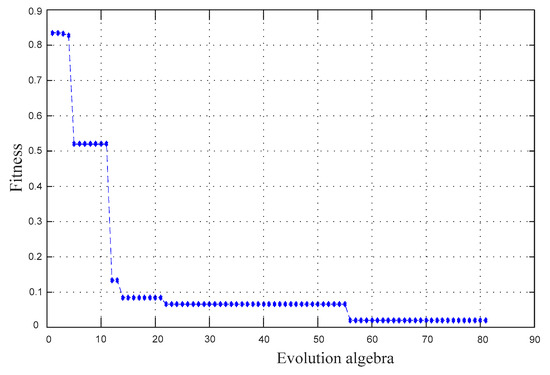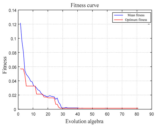 The parameters of the neural network optimized by the genetic algorithm were set as a genetic algebra of 80, population size of 10, crossover probability of 0.3, and mutation probability of 0.1. The iterative descent process of the fitness value in Figure 7 and the simulation diagram of the neural network prediction of genetic algorithm optimization in Figure 8b were obtained via programming simulation. Figure 8a presents a predictive simulation diagram of the neural network without genetic algorithm optimization. Figure 8 is a comparison of the predicted simulation results, and demonstrates that the neural network predictions optimized by the genetic algorithm were more accurate.