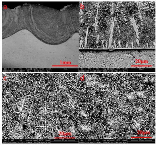 SEM micrographs of the inside of the cladding layer. (a) The overall picture of the cladding layer. (b) The lower, (c) middle, and (d) upper parts of the cladding layer.