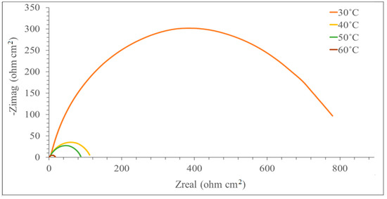 The corrosion of the MS surface in a corrosive environment with DMBHC was investigated at various temperatures (30.0, 40.0, 50.0, and 60.0 °C). Figure 2 demonstrates the Nyquist plots for MS in the presence of the synthesized inhibitor at the concentration 0.5 mM in 1.0 N sulfuric acid at various temperatures. According to Figure 2, the semicircle diameter became minimal as the temperature was raised from 30.0–60.0 °C. The higher the solution temperature, the smaller the diameter of the semicircle. This consequence implies that the CR (corrosion rate) diminishes with the increasing temperature of the solution [39]. We used Gamry Echem Analyst software to analyze the EIS data of the experiments (CPE, Rs, Rct, and Cdl). Table 2 displays the CPE matching data in a corrosive environment in the presence of the inhibitor at the concentration 0.5 mM for mild steel at various temperatures. According to Table 2, a rise in the temperature from 30 °C to 60 °C caused the decreases in Rct and IE. The molecules of the corrosion inhibitor adsorbed on the mild steel surface will experience desorption if the temperature of the solution is increased.