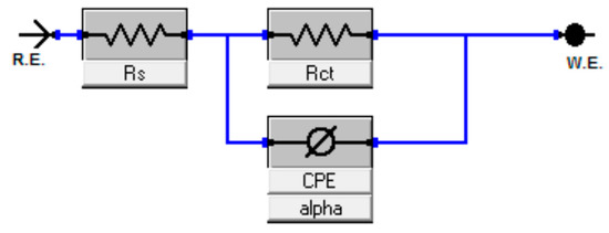 When the results of the EIS have been obtained, the fitting of the circuit was carried out by utilizing the parabolic circuit model. The CPE circle was selected as an equivalent model for matching performance. In Figure 3, the solution resistance was represented by Rs, where the charge transfer resistance and the constant phase element were represented by Rct and CPE, respectively.