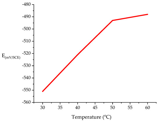 The OCP was measured at varying temperatures at the fixed inhibitor concentration 0.5 mM. The OCP (Figure 4) increased in the range of 40 and 60 °C, demonstrating that the counterpart sample of mild steel corrosion due to the considerable amounts of protection causing debilitation, and the inhibitor could further expedite the corrosion rate. In other words, a high temperature decreased the effectiveness of the inhibitor [45,46].