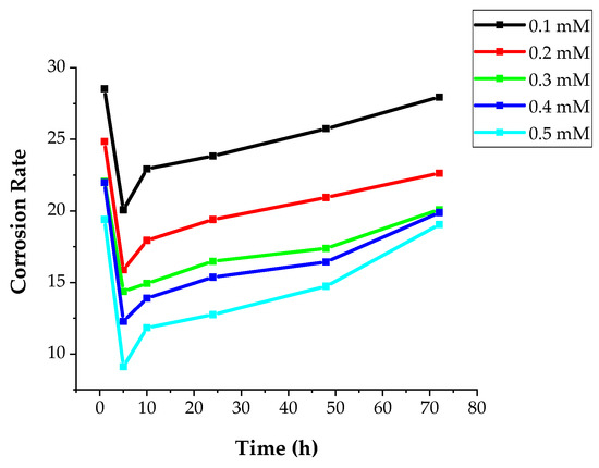 The calculated average values were carried out after repeating each measurement three times. The immersion tests were performed and achieved at temperature levels of 60, 70, 80, and 90 °C with the addition of various concentrations of the inhibitor (0, 0.1, 0.2, 0.3, 0.4, and 0.5 mM). The duration of the immersion times was 1, 5, 10, 24, and 48 h, respectively. Corrosion rates (CRs) in (mm/y) and inhibition efficiencies (IE%) in addition to surface coverage (θ) can be calculated according to Equations (1)–(3).