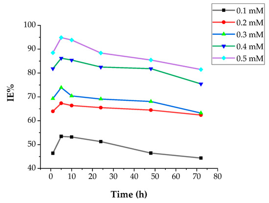 IE with various immersion times, h, in 1.0 N H2SO4 solution at 30 °C with various concentrations of DMBHC.