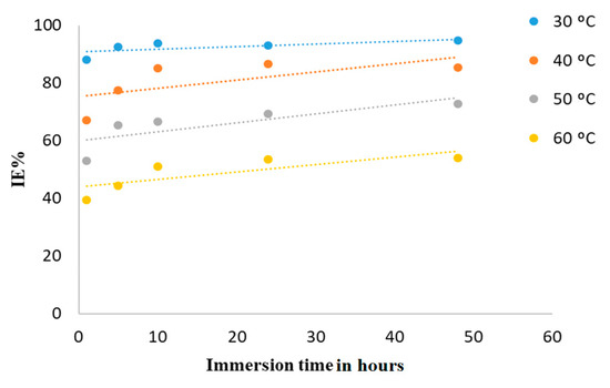The effect of temperature on IE% is illustrated in Figure 8. It shows a perfect significance for the IE% drop with temperature rise due to the physical–chemical adsorption.