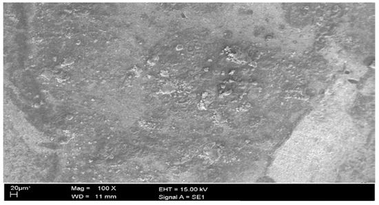 The scanning electron microscope was located in the Unit of Electron Microscopy at the Universiti Kebangsaan Malaysia. Figure 10 shows the micrograph of the coupon surface where it can be observed that the surface was corroded and rough in the corrosive solution in the absence of the corrosion inhibitor. The metal surface was extremely attacked by sulfuric acid. In Figure 11, the metal surface was not considerably affected by corrosion due to formation of a protection film on the metal surface. This suggests that the synthesized corrosion inhibitor has the ability to inhibit the pitting corrosion of a metal surface in a 1N H2SO4 environment.