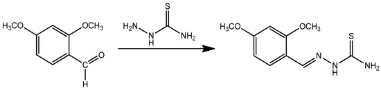 A solution of thiosemicarbazide (2.0 mM) in methyl alcohol (70 mL) was refluxed with 2,4-dimethoxybenzaldehyde (2.0 mM), for seven hours. After completion of the reaction, the precipitate was filtered, washed with methyl alcohol, and dried to yield 52% of a white solid, melting point: 189–192 °C. The chemical structure of the synthesized inhibitor is demonstrated in Scheme 1. The inhibitor molecule was characterized via spectroscopic techniques namely FTIR, NMR, and CHN (carbon hydrogen and nitrogen) analysis. The CHN and analytical calculation/found for the synthesized inhibitor with the chemical formula C10H13N3O2S: C, 50.19/49.67; H, 5.48/5.35; N, 17.56/17.44. FTIR: 3411.6, 3289.1 and 3201.7 (N–H), and 1596.4 (C=N). 1H-NMR in DMSO-d6 (ppm): 3.79(s, 3H for OCH3), 3.81 (s, 3H for OCH3), 6.63, 6.66, and 7.51 (d,1H for aromatic ring), 8.58 (s,1H for N=CH), and 7.49 (1H for NH). 13C-NMR in DMSO-d6 (ppm): 57.13, 58.03, 103.10, 103.8, 108.87, 130.82, 149.02, 160.22, 163.21, 177.90.
