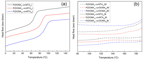 DSC curves of (a) P(DOMAx-co-MTAy) copolymers and (b) P(DOMAx-co-MTAy)M and P(DOMAx-co-MTAy)B cationic copolymers.