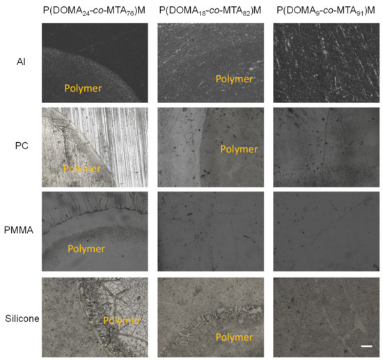 Optical images of coatings made from P(DOMAx-co-MTAy)M copolymers onto different substrates. Scale bar = 250 µm.