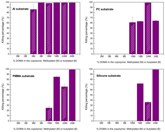 Then, the efficacy of these cationic coatings with adhesive anchors of dopamine to kill Gram-positive S. aureus upon contact was analyzed as a function of dopamine moieties content, alkylating agent, and substrate. The antimicrobial activity was evaluated by the E2149-13a standard method of the ASTM [13]. Before the test, films were immersed in distilled water for 3 h in order to remove the polymers non-strongly attached onto the substrates. PMMA, PC, silicone, and Al substrates were used as control. Figure 6 displays the antibacterial activity of all the coatings presented as the percentage of bacteria kill, which was calculated by the following equation: