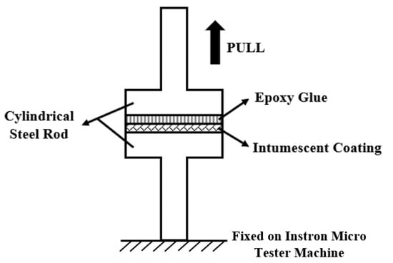 Figure 3 shows the experimental setup for the measurement of adhesion strength of the coating samples. The samples were coated with a thickness of 2 ± 0.2 mm IFRC on one side of the cylindrical steel rod. After that, the coated cylindrical steel rod was then attached to a bare cylindrical steel rod using an epoxy glue with a thickness of 2 ± 0.2 mm. Two cylindrical steel rods were then tested using the Instron Micro Tester–Universal Testing machine manufactured by Instron in Norwood, MA, USA with a constant rate of 1 mm/min continually drawn apart in tensile mode until the coating samples on the cylindrical steel rods tore apart. The adhesion strength of the coating sample in MPa is calculated based on the following Equation (1) []: