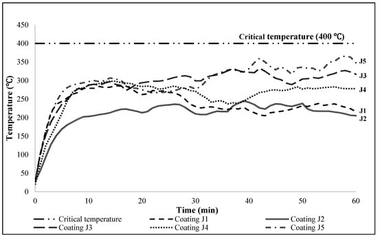 The purpose of this specified test is to characterize the physical and chemical reactions of the char formation of the IFRC. The temperature profiles of the steel plates coated with five IFRC formulations (J1–J5) and the bare steel plate were compared after 60 min of fire testing. In this experimental work, the temperature of 400 °C was chosen as the critical temperature for the coated sample with IFRC []. The fire protection results of the coated steel plates were then plotted as a function of time and presented in Figure 5.