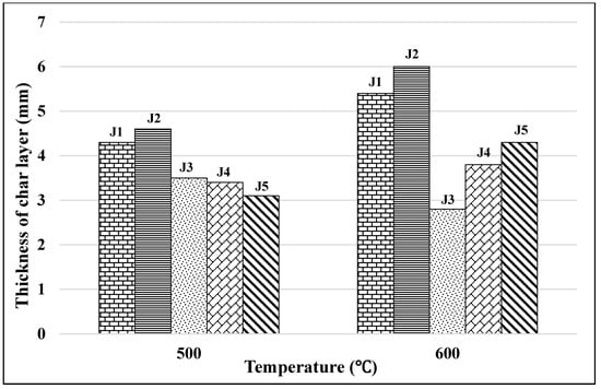 The purpose of the furnace test is to investigate and critically assess the fire protection performance of the coated samples by measuring the thickness of the char layer at temperatures of 500 and 600 °C. The thicknesses of the char layer have been measured and recorded in Figure 6. Based on the results, all of the char layers have expanded from 500 to 600 °C except coating J3. From the result obtained, it can be observed that the char layer of coatings J3, J4 and J5 with the addition of magnesium hydroxide has a slightly less thick char layer as compared to coatings J1 and J2. These phenomena are due to the flame-retardant filler (i.e., magnesium hydroxide) that has a negative contribution toward a fire-protective performance. It has a poor char expansion and resulted in failing to provide the required thick insulating barriers to protect the underlying steel plate from the heat. The thickness of coating J3 increased at 500 °C, this is because of the gaseous water phase during the decomposition of Mg(OH)2 filler envelop the flame, and thereby excluding the oxygen and diluting flammable gases []. Whereas the thickness of the char layer of coating J3 decreased at 600 °C, this is due to the fire that propagated through the fire-protective barrier which thus led to a decrease of thickness of the char layer.