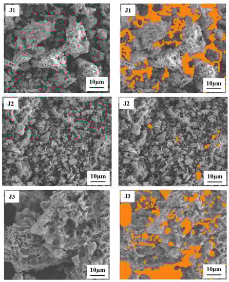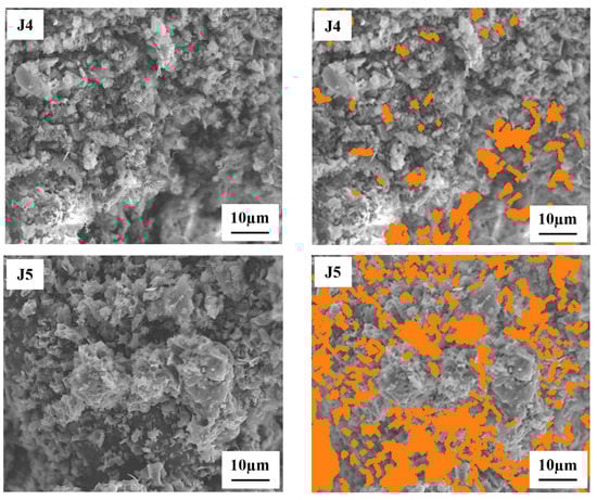 Microscopic analyses are executed with the scanning electron microscope (SEM) to examine and analyze the surface morphology of the intumescent coating. The SEM micrographic images of all char layers of coated samples after the Bunsen burner test are shown in Figure 7. The orange color indicates the holes and voids in the char layer of the coated samples. The images of coatings J1, J3, J4 and J5 illustrated larger holes and voids. These holes are formed because of trapped gas by its blowing agent when the coating is exposed to fire []. The tiny holes and void structures can be the consequence of fire and heat propagation. The fire and heat propagated to the crack lines on the foam structure can also lead to a poor fire-protective performance of the coating []. On the other hand, the char layer of coating J2 has displayed a more uniform and denser foam structure which can strongly adhere to the steel substrate after the fire test. This rigid formation can contribute to the enrichment of the fire-protective performance on the coated steel substrate and subsequently lead to better characteristic properties of the coating. Therefore, a fire protective performance which indicates the competency of the char layer in fire resistance is highly dependent on its physical structure of the coating []. Hence, when selecting the specified formulation of flame-retardant fillers, it is worth noting that the coating needs to be able to enhance the intumescent coating performance in terms of fire protection and thermal properties.