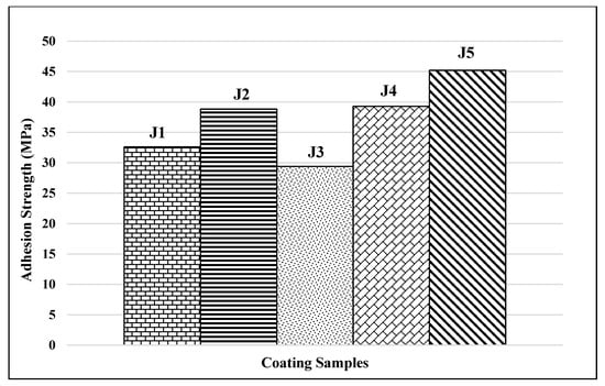 This test is carried out to determine the adhesion strength of the coated samples. The average adhesion strength amongst all coating samples is tabulated and presented in Figure 8. All the coating samples show good adhesion strength values. The coatings J1–J5 have showed higher adhesion strength values ranging from 1.05 to 1.45 MPa. The increased adhesion strength can be interpreted due to the influence of the carbonyl group between VA copolymer and the surface oxide or hydroxide of steel substrate that has created a stronger carbon–hydrogen (CH) bond in the mixture of the coating. The intermolecular bonding between the flame-retardant fillers’ molecules has further improved the interaction between the coating and the steel substrate as well as between themselves []. This is not to disregard the carbon–hydrogen bonding, which in fact has a significant role in the adhesive properties of the coating. The carbon–hydrogen bonding is formed between a strongly electronegative atom that is usually oxygen and a hydrogen atom. The hydrogen bonds are formed between a monomer of the VA copolymer molecule and the steel substrate.