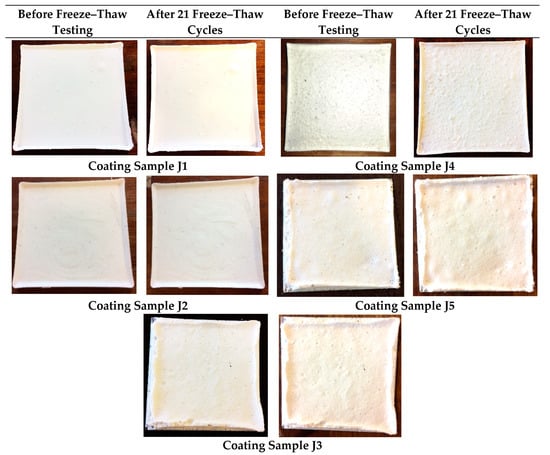 The freeze–thaw resistance test was used to determine the ability of the coating sample to withstand the highly destructive forces of cyclic freezing and thawing. The coating samples were coated onto different sets of 50 mm × 50 mm × 1 mm steel plates with a thickness of 2 ± 0.2 mm. The coating samples were placed in an air flow at 25 °C for 8 h and then placed in the freezer at −20 °C for another 8 h. Lastly, the coating samples were heated in a drying oven at 50 °C for another 8 h. This process is noted as a freeze–thaw cycle period [].