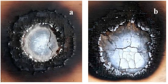 Besides that, an appropriate combination of intumescent flame-retardant coating with vermiculite and perlite can also lead to a lower heat transmission and reveal less surface cracks, resulting in the reduction of temperature up to 54.9 °C as compared to the commercial prototype after the 2 h fire test, as seen in Figure 13. Furthermore, the higher temperatures of the commercial prototype measured at T1 and T2 are also higher than those measured for the P2 prototype as evident in Figure 13b with numerous cracks on the surface of the prototype providing higher rates of heat transfer to the backside of the prototype.