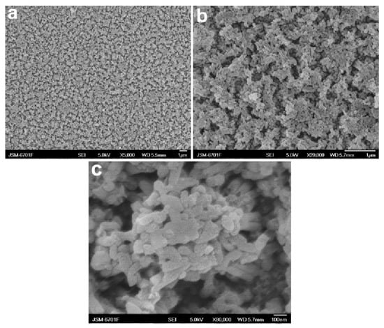 Figure 11b shows that the morphology of the coating was mainly a granular structure. Increasing the content of TiO2 to 0.225 g changed the morphology to rough fibers with an average diameter of 275 nm. At the highest concentration of TiO2, a finer and more organized, nanofibrous morphology developed.